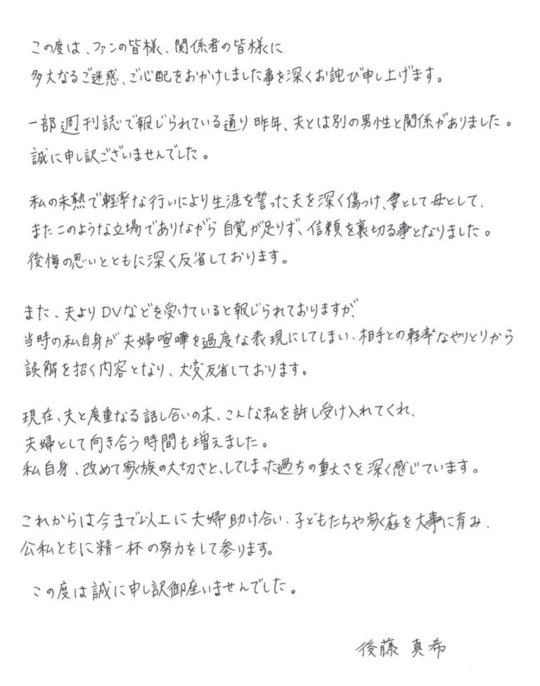 私の未熟で軽率な行いにより生涯を誓った夫を深く傷つけ、妻として母として、またこのような立場でありながら、自覚が足りず、信頼を裏切る事となりました。後悔の思いとともに深く反省しております。