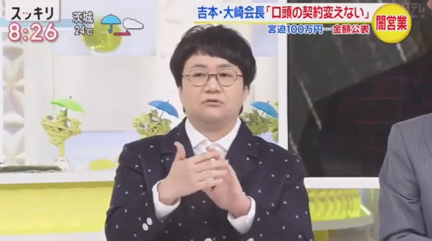 また、吉本興業の大崎会長が「今後も書面で契約を交わすことはない。口頭の契約を変えない」としている点について「口頭だったとしても、芸人も納得してお互い同意しないと契約って結ばれないと思うんですよね。私は吉本から口頭でも聞いた覚えはないですし。『会社にいくら入ってあなたの取り分はこうです』とか、他の問題に関しても何もないですよね。会長のおっしゃっていることと芸人の間での相違がすごくて、これで納得している芸人っていないと思います」と苦言を呈した。