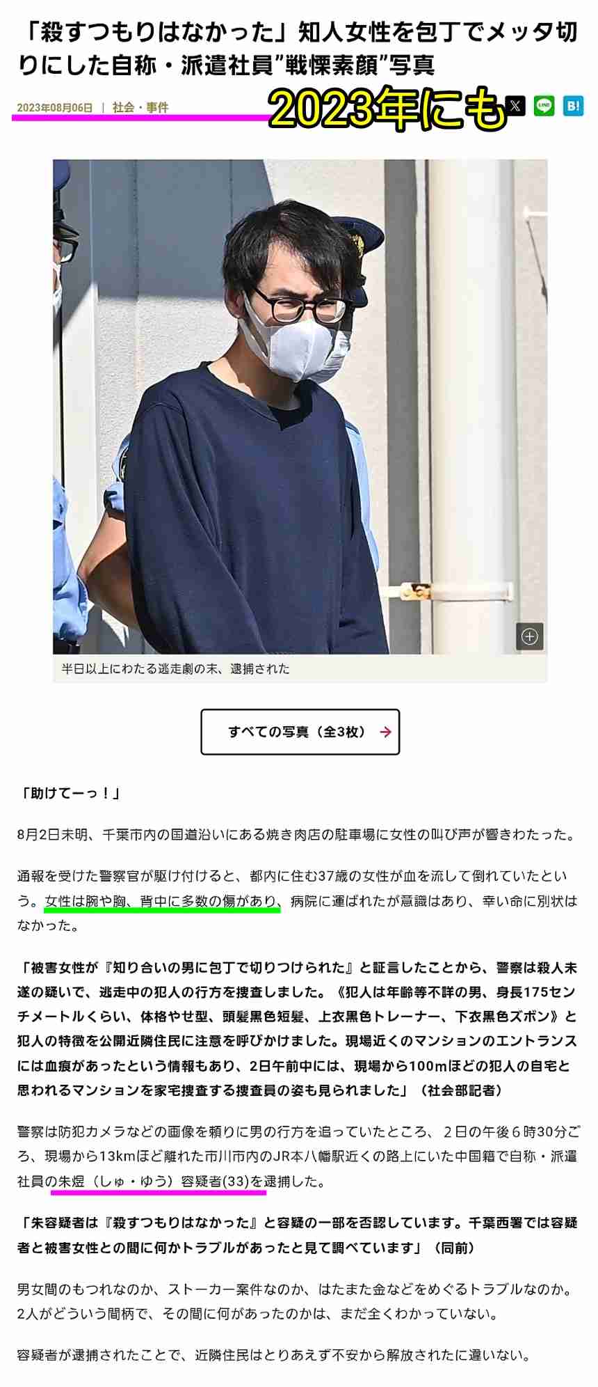 今月会社員の女性が中国人に刺頃された事件があったね